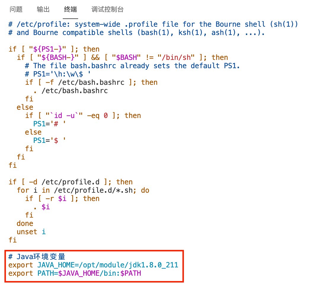 将JDK解压命令截图并提交到对应的任务序号下 修改容器中/etc/profile文件,在文件末添加下面的内容:
