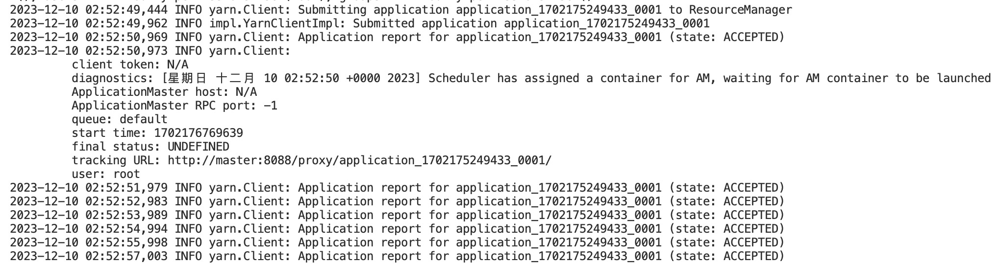 注意: 如果容器的hostname不是master1,比如终端命令行名称类似上面图中的 root@abc03160ba3f,注意把容器对应的 abc03160ba3f 这样的实际名称也加进hosts文件的解析里,不然yarn可能会找不到可调度的主机,提交的任务会一直卡在accept阶段。 添加后的/etc/hosts文件内容类似于: