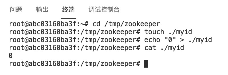 根据添加的配置内容,在三个节点的/tmp/zookeeper下创建 myid 文件,并在该文件中写上节点IP对应的数字即可,对应上面的0,1,2 比如配置文件里为server.0=10.42.240.106:2888:3888,那么就在10.42.240.106对应的节点下执行下面的命令: