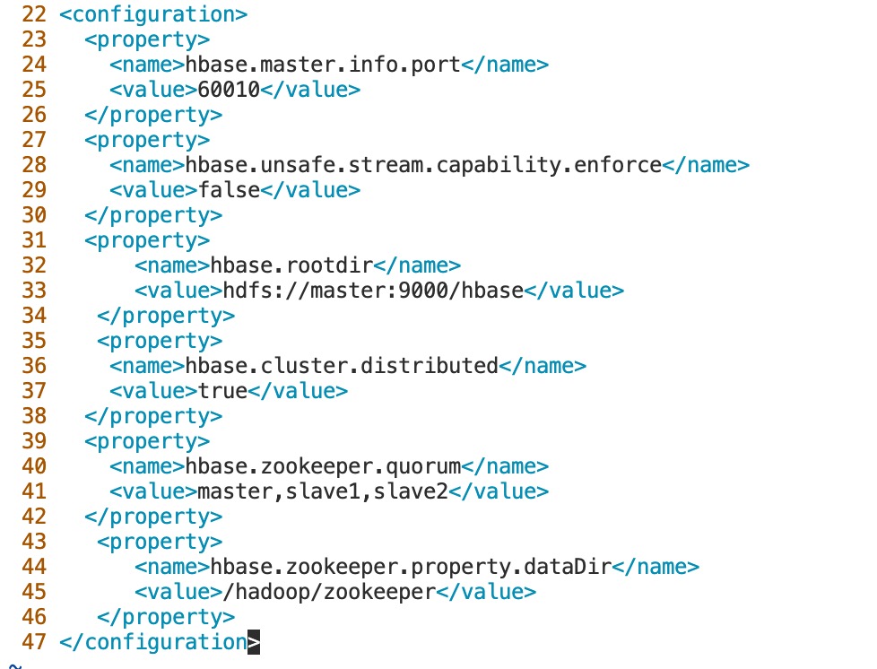 配置/opt/module/hbase-2.4.14/conf/路径下的3个重要的配置文件: hbase-site.xml,hbase-env.sh,regionservers。 下面是添加好的文件的内容: 如果使用vim的话,有一个快捷方式,进入命令模式输入 :set number 显示行号,然后使用比如 :22,54d 这样的命令快速删除从22行到54行之间的内容。 1、hbase-site.xml